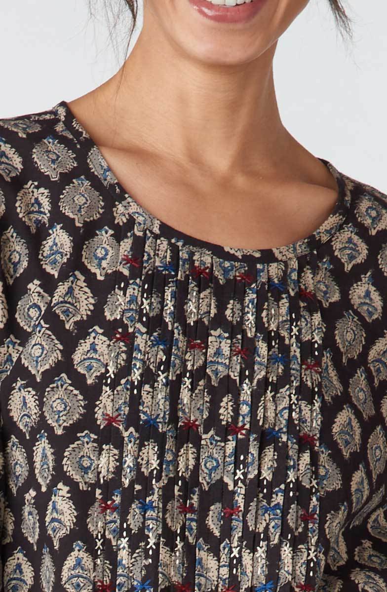 Effortless Kalamkari pullover dress handprinted in grey, beige and blue natural dyes. Hand embroidered pintucks give a gentle gathering to the skirt. Ready to double as a tunic.