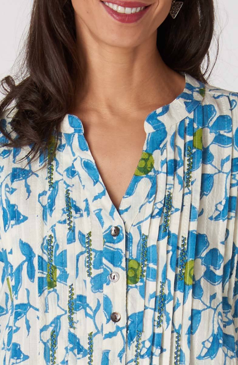 Soft textured cotton dress with teal blue and green floral block prints. The pleated bodice with gentle gathers has hand embroidery embellishments. Band collar with notch-neck and button placket.