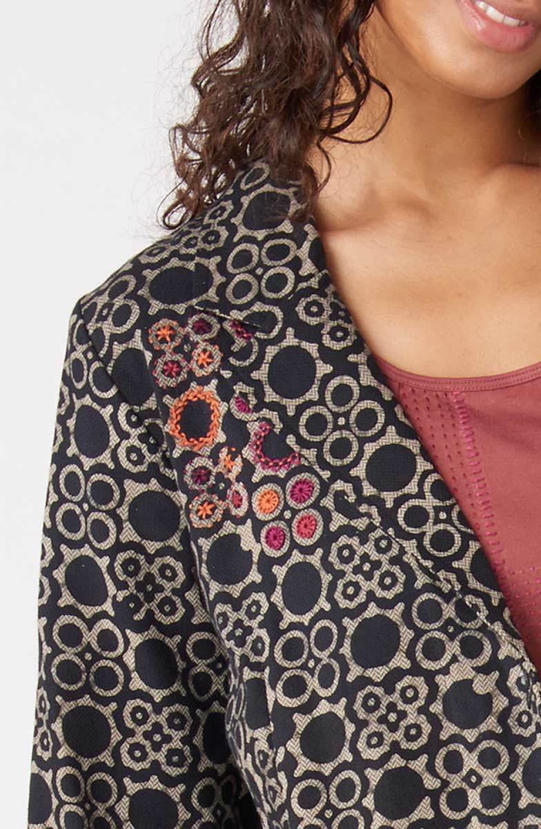 The perfect combination of blazer styling and mediumweight herringbone weave cotton makes a versatile jacket for any occasion. The black batik block print is accented with orange and red hand embroidery. Single-button closure.