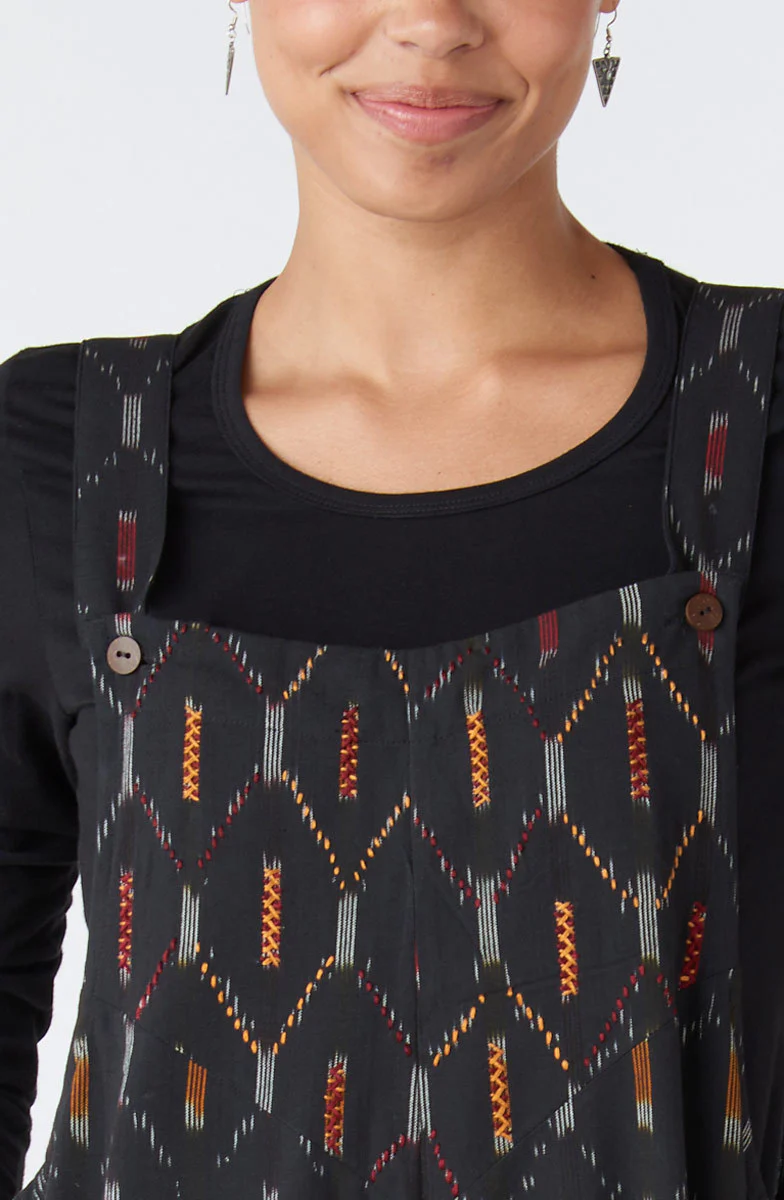 Cropped straight-leg overalls feature adjustable button straps and a black ikat fabric with white, red, and gold woven details. Hand embroidery on the bib adds a unique touch, perfect for layering over a MarketPlace top or tee.