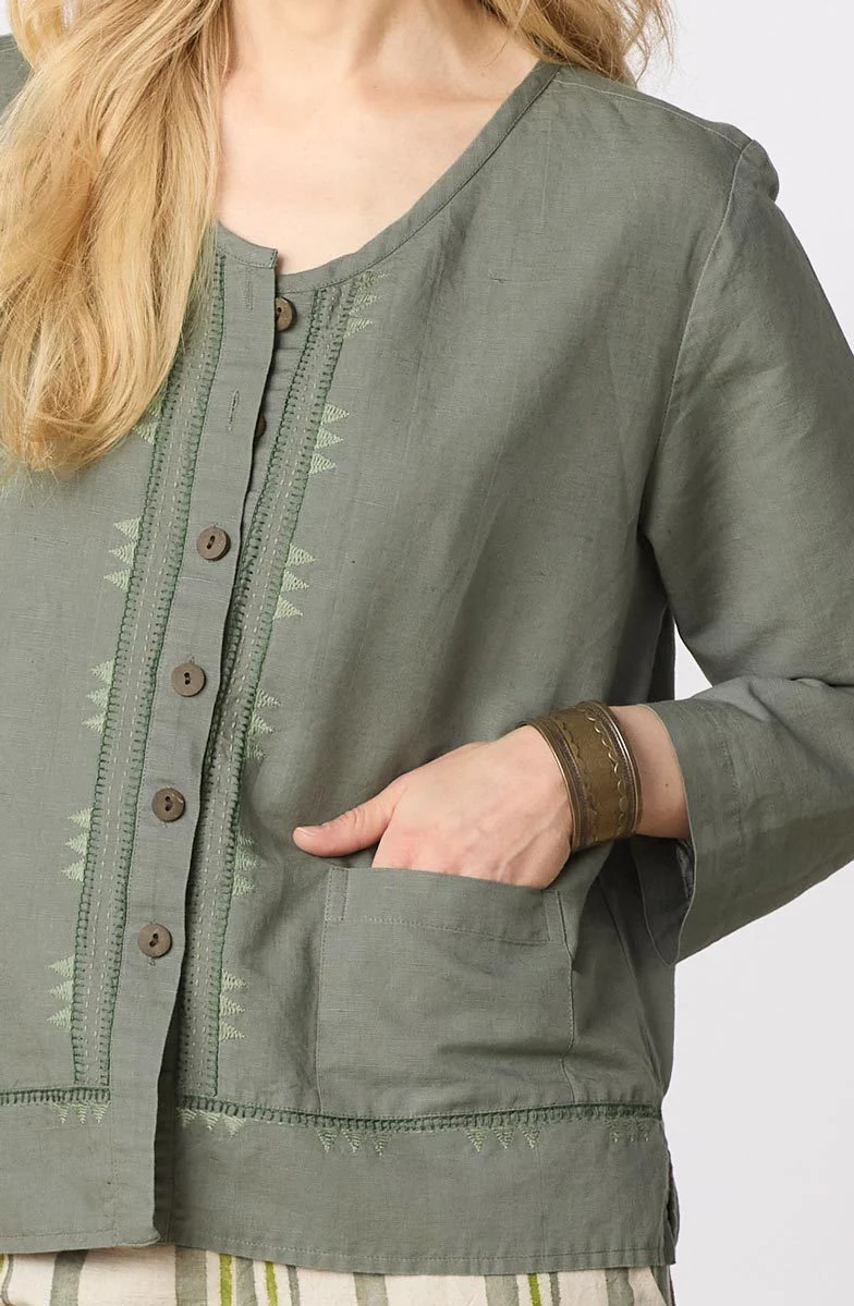 Elegant scoop neck jacket in herbal green linen/cotton blend can double as a top, ready to pair with a MarketPlace pant. Button-front and hem are highlighted with tonal hand embroidery. Generously cut - consider sizing down for a less oversized look.