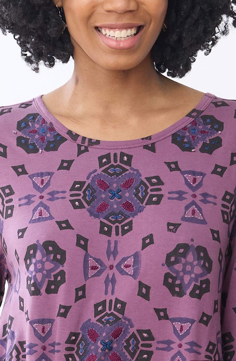 Eco-friendly organics + unique styling. This organic cotton jersey purple plum pullover dress handprinted with organic ink features a diagonal waist seam with a front pocket on the seam. The handkerchief hem gives a great sweep. Hand embroidery accents.
