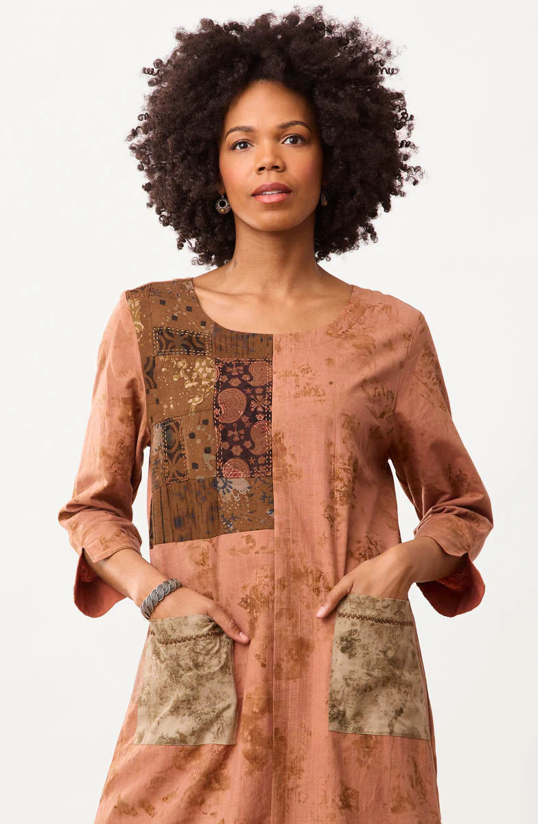 Our eco-friendly organic cotton shift dress in subtle autumn colors has an upcycled Chindi patchwork panel and seam button detail in the left side. The handprints have been created by skilled artisans who steam onion peels directly onto the fabric to transfer their design and color. Hand embroidery accents the Chindi panel and contrasting green front pockets. The style is unique, and each dress is unique! While the dominant color is brown, the Chindi patchwork colors and patterns may vary due to the variety of upcycled fabrics.