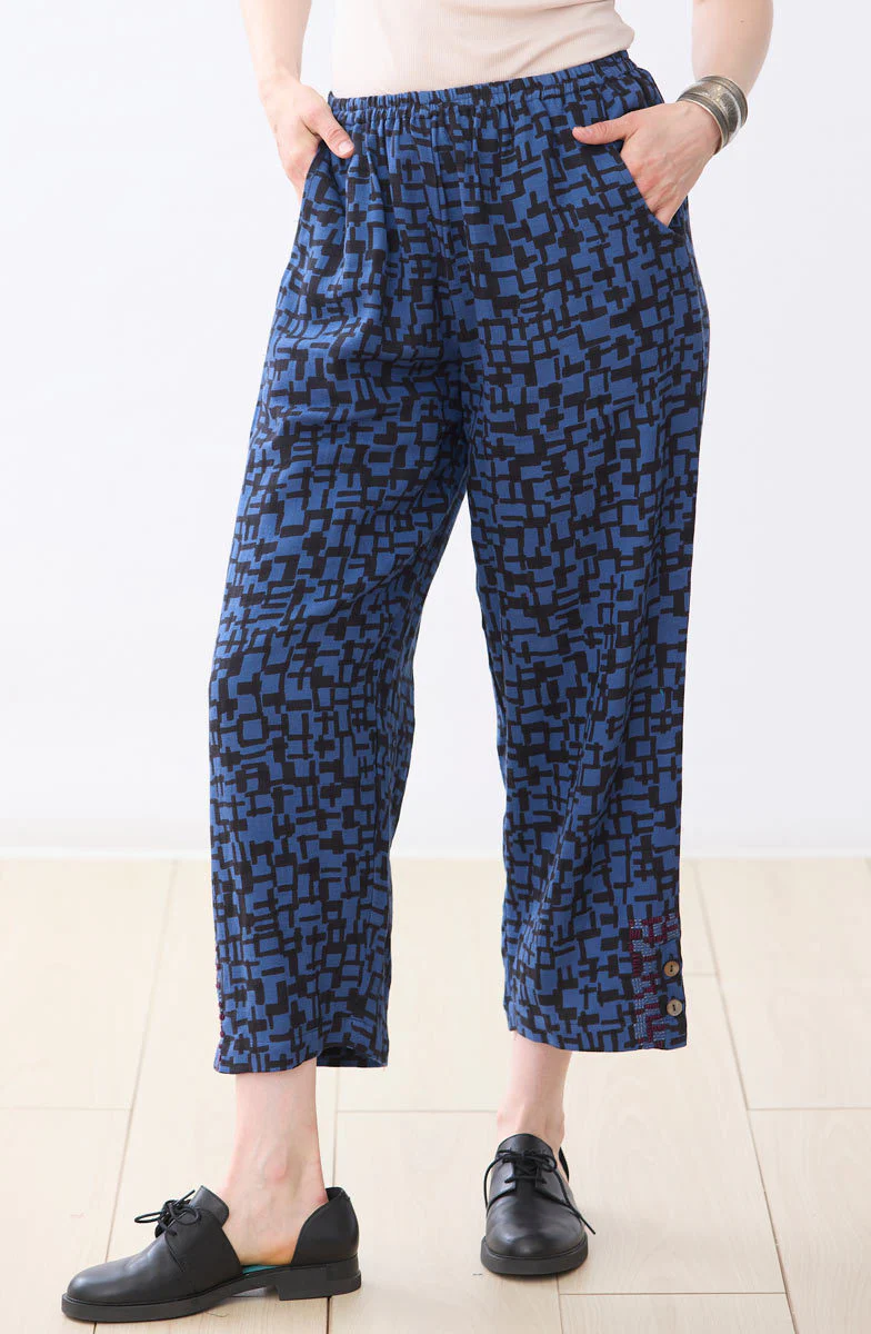 Our versatile straight leg pant in blockprinted marine-blue cotton crepe, with an embroidered button detail at the hem. The flood length pull-on style sits at natural waist with an easy fit through hip and thigh.