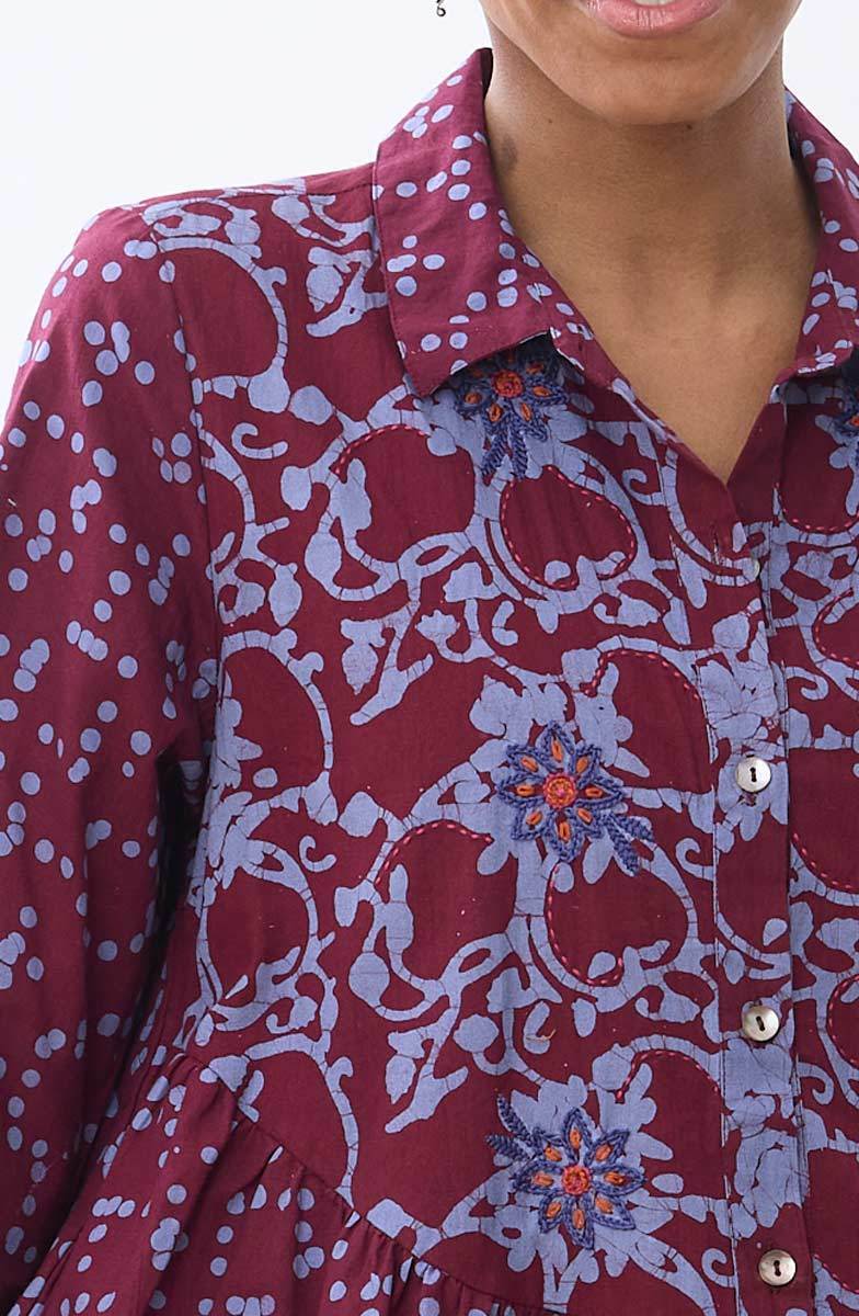 A uniquely curved yoke defines this deep red and light blue batik block print tunic. Curving downward in the front and rising in the back, the contrast yoke gives gentle gathers all around. Button front has contrast placket. Long sleeves with button cuffs. Hand embroidery embellishes the yoke.