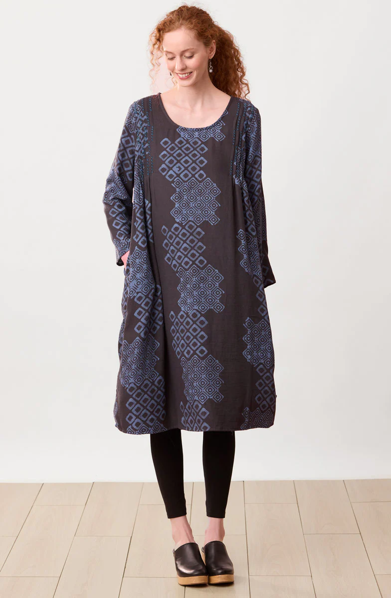 Soft cotton crepe dress with grey-green and light blue batik block prints. Side pleats front and back and a swingy skirt give a full sweep. Hand embroidery accents the front pleats.