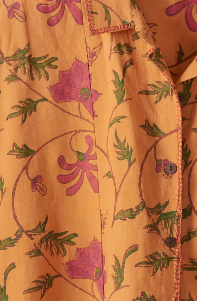 Eco-friendly organic cotton cap sleeve shirt in rich honey-orange is blockprinted with red and green organic ink florals. Back yoke and pocket feature a coordinating blockprint. Placket and collar are highlighted with orange hand embroidery.