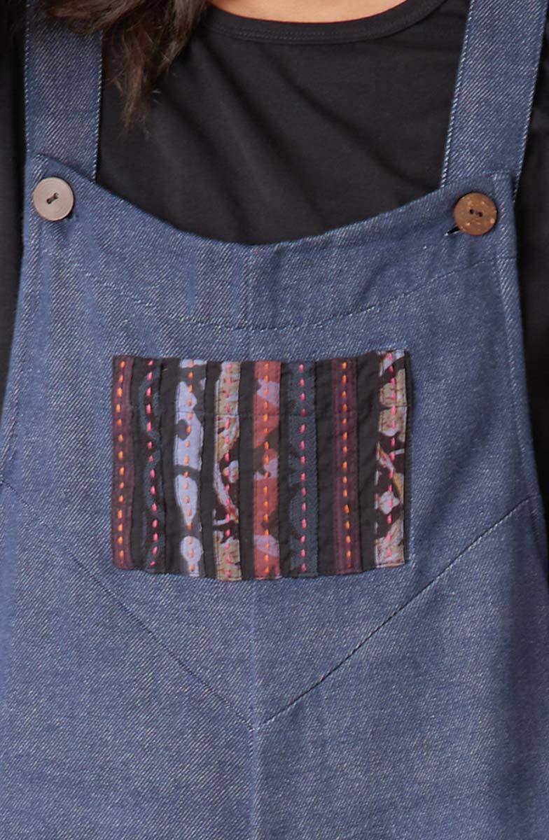 Our favorite straight-leg overalls go upcycled! With a cropped length and adjustable button straps, these handwoven recycled-yarn denim overalls feature embroidered chindi patchwork pockets--one on the bib and a cargo pocket on the leg. A durable and sustainable choice, hearty denim handwoven with recycled fibers blends strength and eco-consciousness. The handwoven texture adds a unique artisanal touch, while the incorporation of recycled materials reduces waste. Chindi patchwork colors and patterns may vary due to the variety of upcycled fabrics.