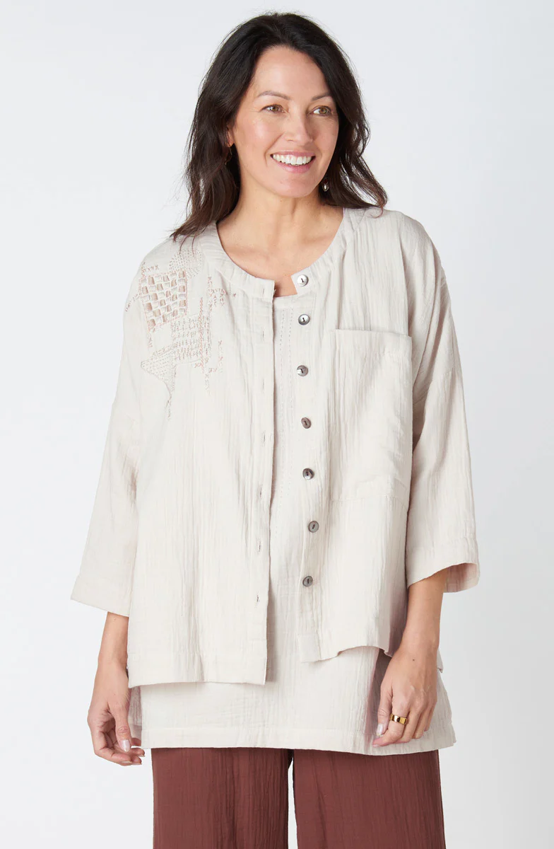 Deceptively simple button-front jacket in soft double gauze works as a top or a jacket. Intricate dimensional hand embroidery makes this soft shirt-jacket special. Dropped shoulders and three-quarter length sleeves. Generously cut — consider sizing down for a less oversized look.
