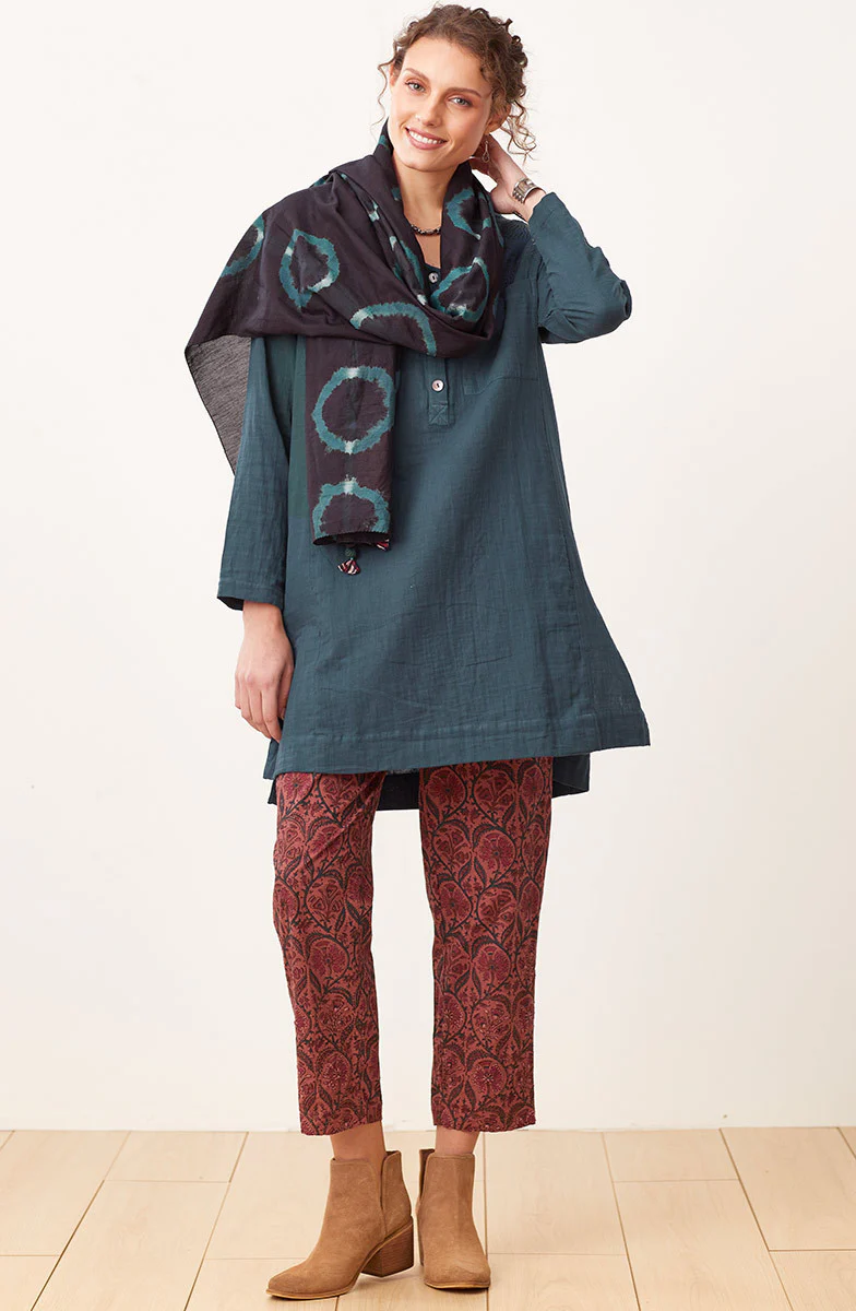Striking blue-green shibori tie-dye on a soft organic cotton/silk scarf. Hand-stitched rolled edges with chindi accent tassels.
