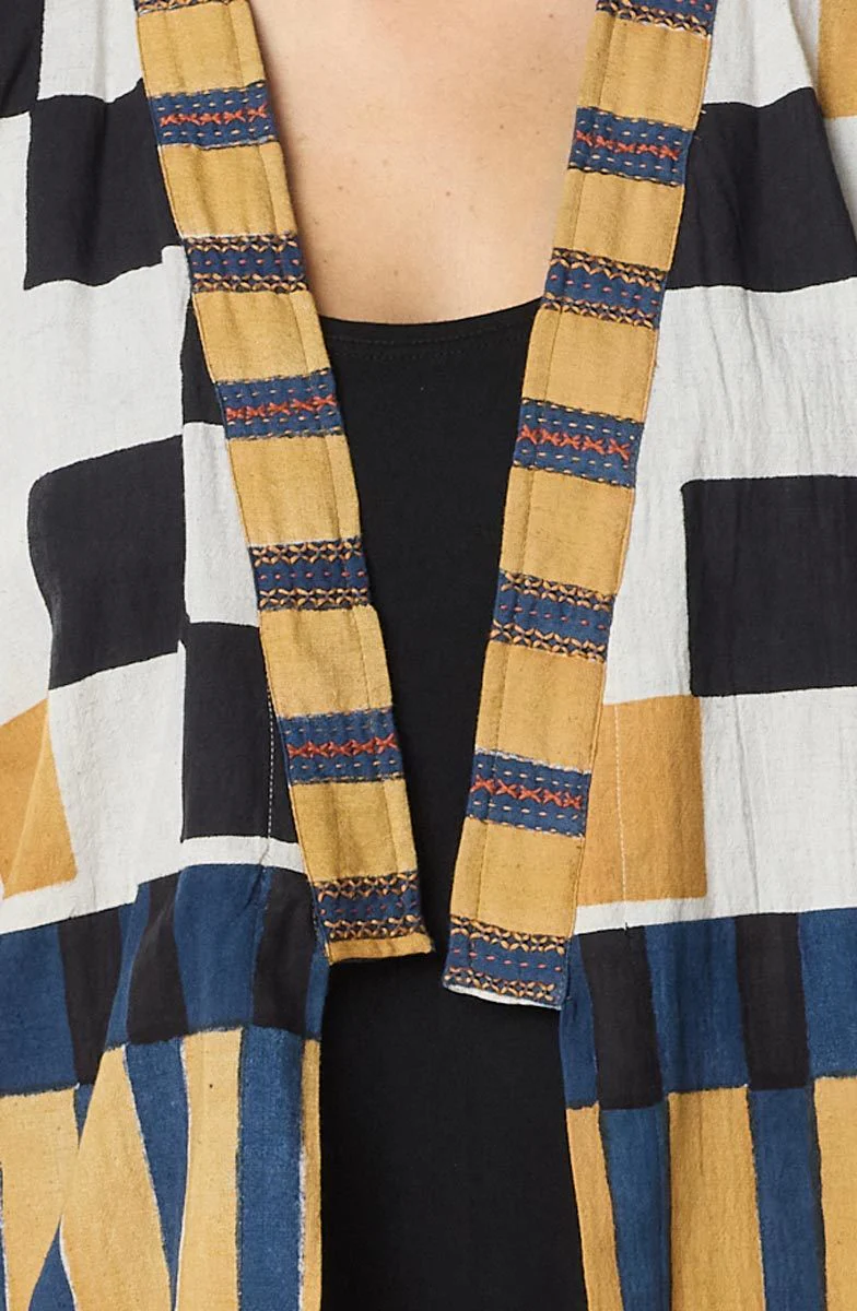 Artful, unstructured jacket features blue, black and gold blockprints on soft natural color. Made of cotton woven with a hint of linen for a smooth texture, with hand embroidery highlights on the lapel. Three-quarter length sleeves, ready to cuff. Generously cut - consider sizing down for a less oversized look.
