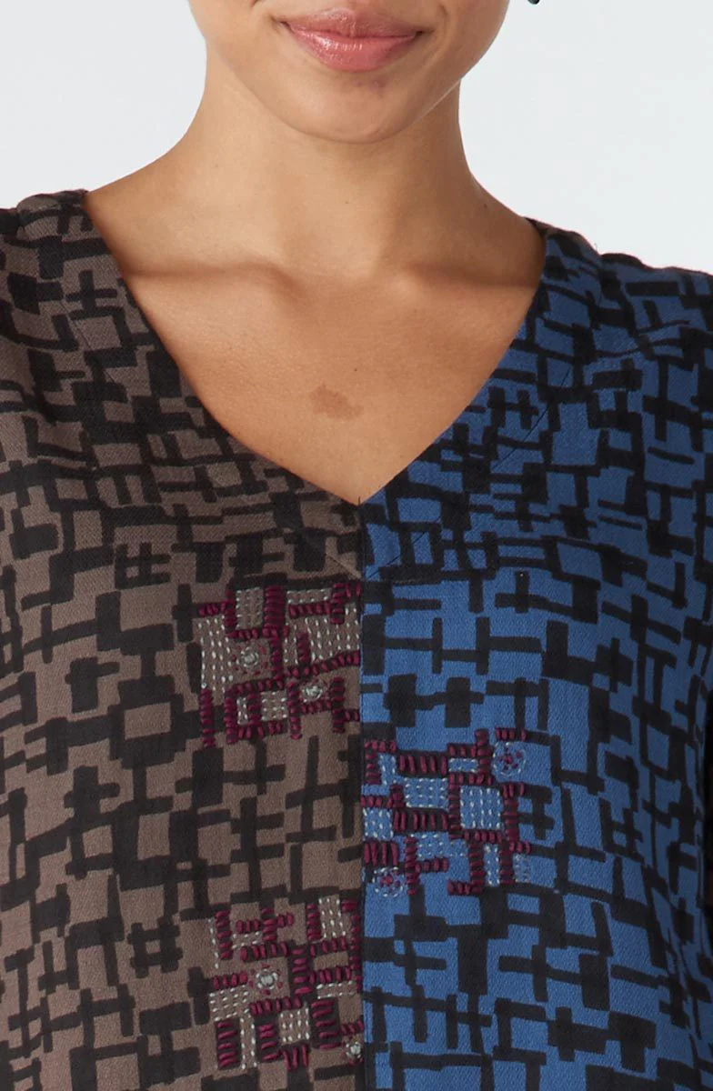Our MarketPlace signature V-neck top in soft cotton crepe with block print of stone brown with a contrast panel in deep blue. Hand embroidery embellishes the center seam. Shirttail hem, side slits.