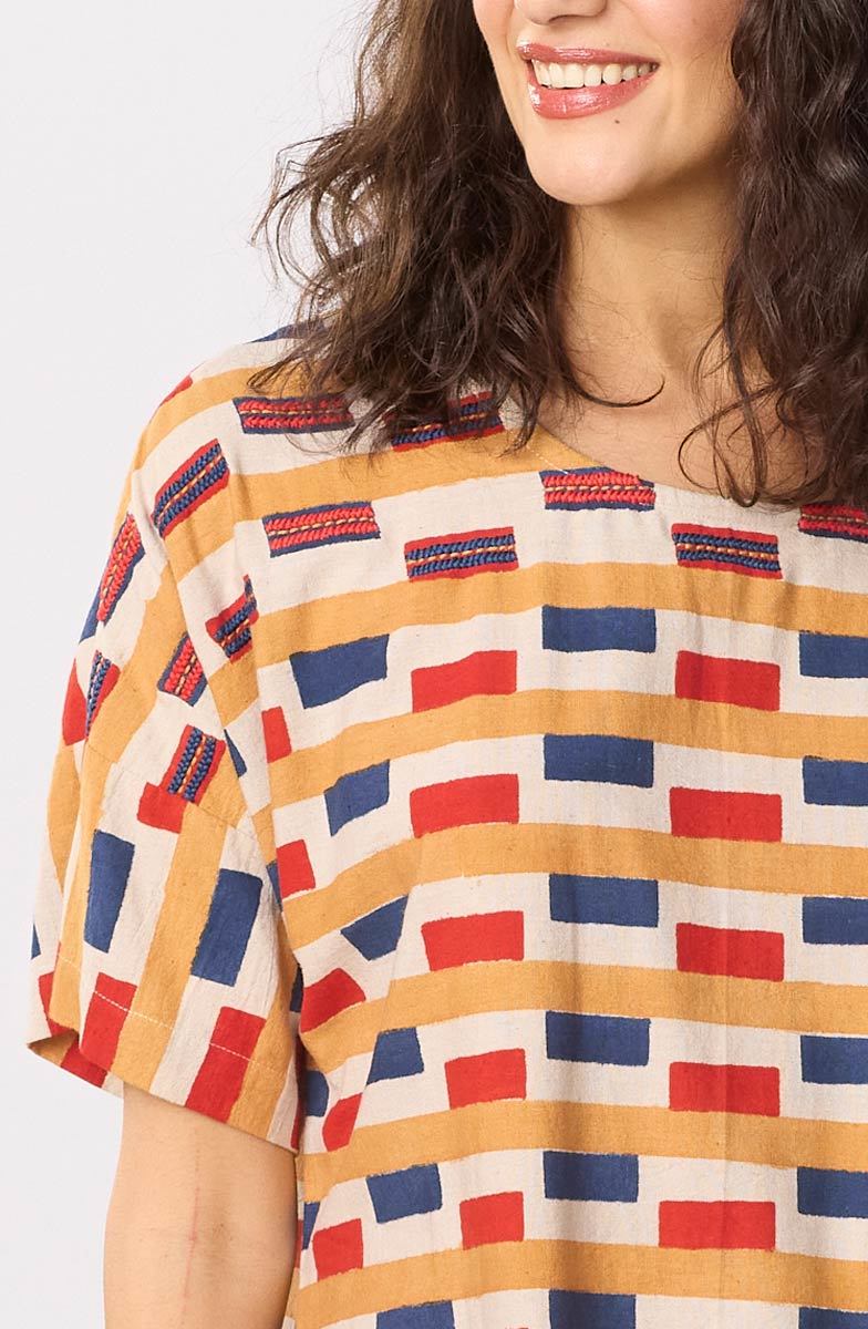 Pullover shift dress in cotton woven with a hint of linen for a smooth texture. Energized with block prints in red, blue and gold on natural off-white, this easy-on dress has dropped shoulders and short sleeves. Hand embroidery highlights on shoulders.