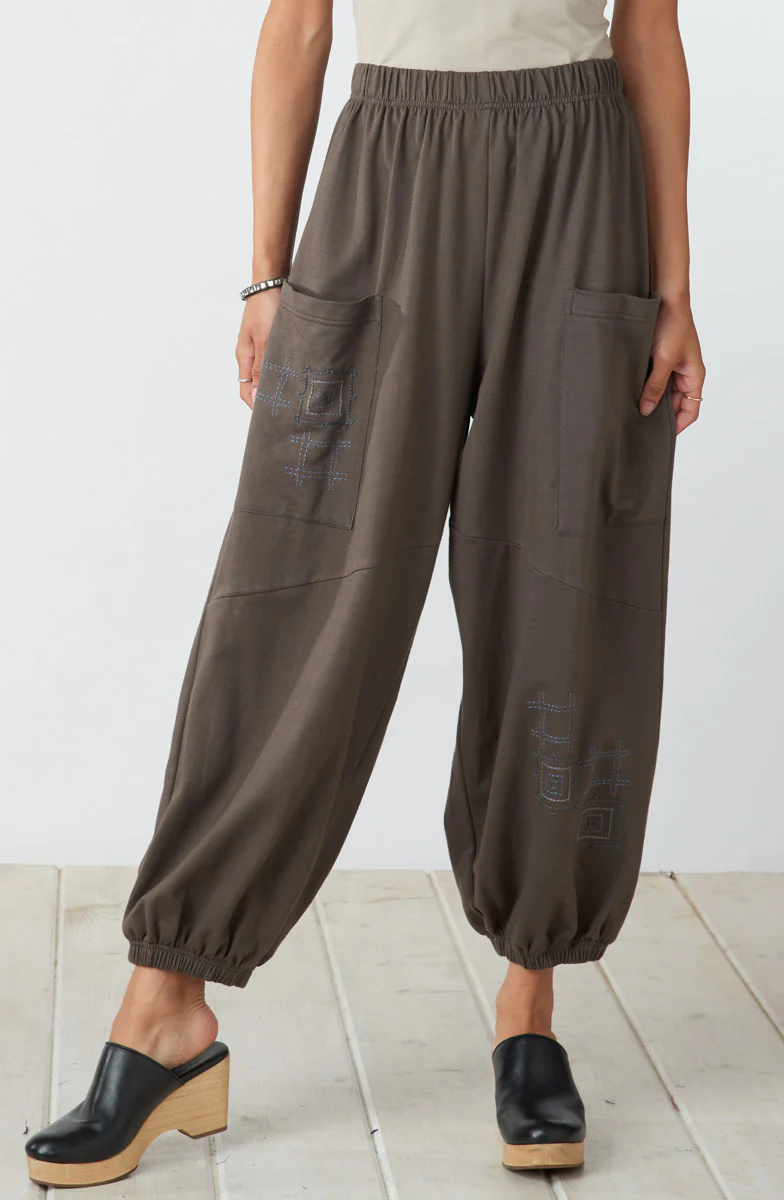 Casual comfort: soft knit pant in dusty green has a gathered ankle. The cropped French Terry pant has an angled leg seam and blue and green hand embroidery embellishments on the leg and pocket.